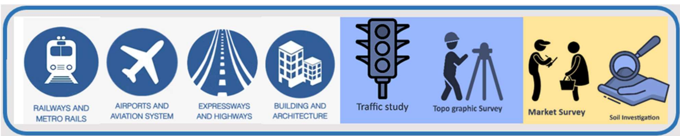 We undertake various Surveys and Project Consultancy for Buildings, Airports, Railways, Mobility Hubs, Highways, Urban Infrastructure & Community development, etc.